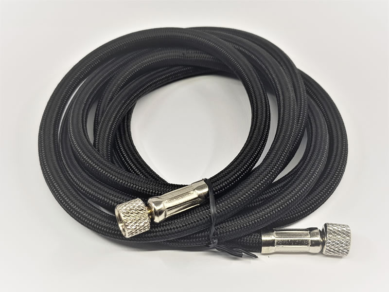 Mangueira de borracha revestida de tecido por fora , própria para conectar o aerógrafo ao compressor , 2 saídas giratórias 1/4 x 1/4 com comprimento 1.80 metros .
